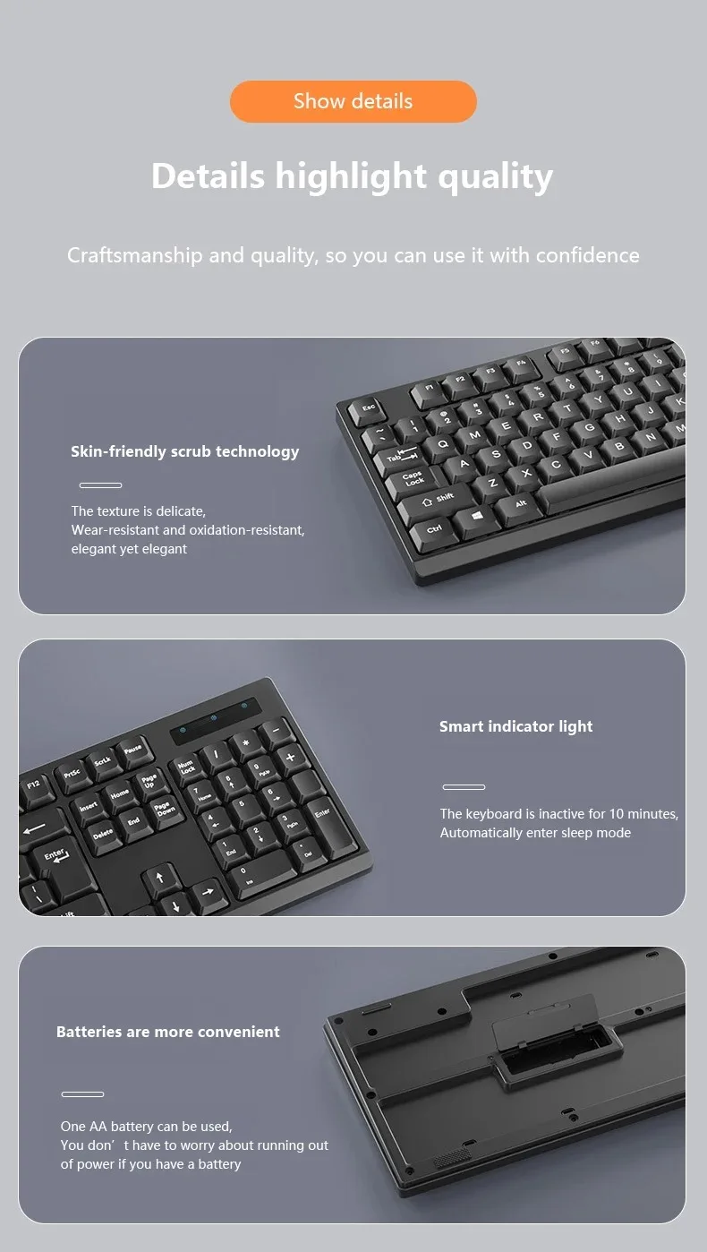 O Conjunto Sem Fio de Teclado e Mouse Kebidumei foi desenvolvido para quem busca eficiência e praticidade no dia a dia. Compacto, leve e silencioso, oferece digitação suave e precisa, além de um mouse ergonômico com sensibilidade ajustada para máxima agilidade. Ideal para escritório, estudos, jogos ou home office.