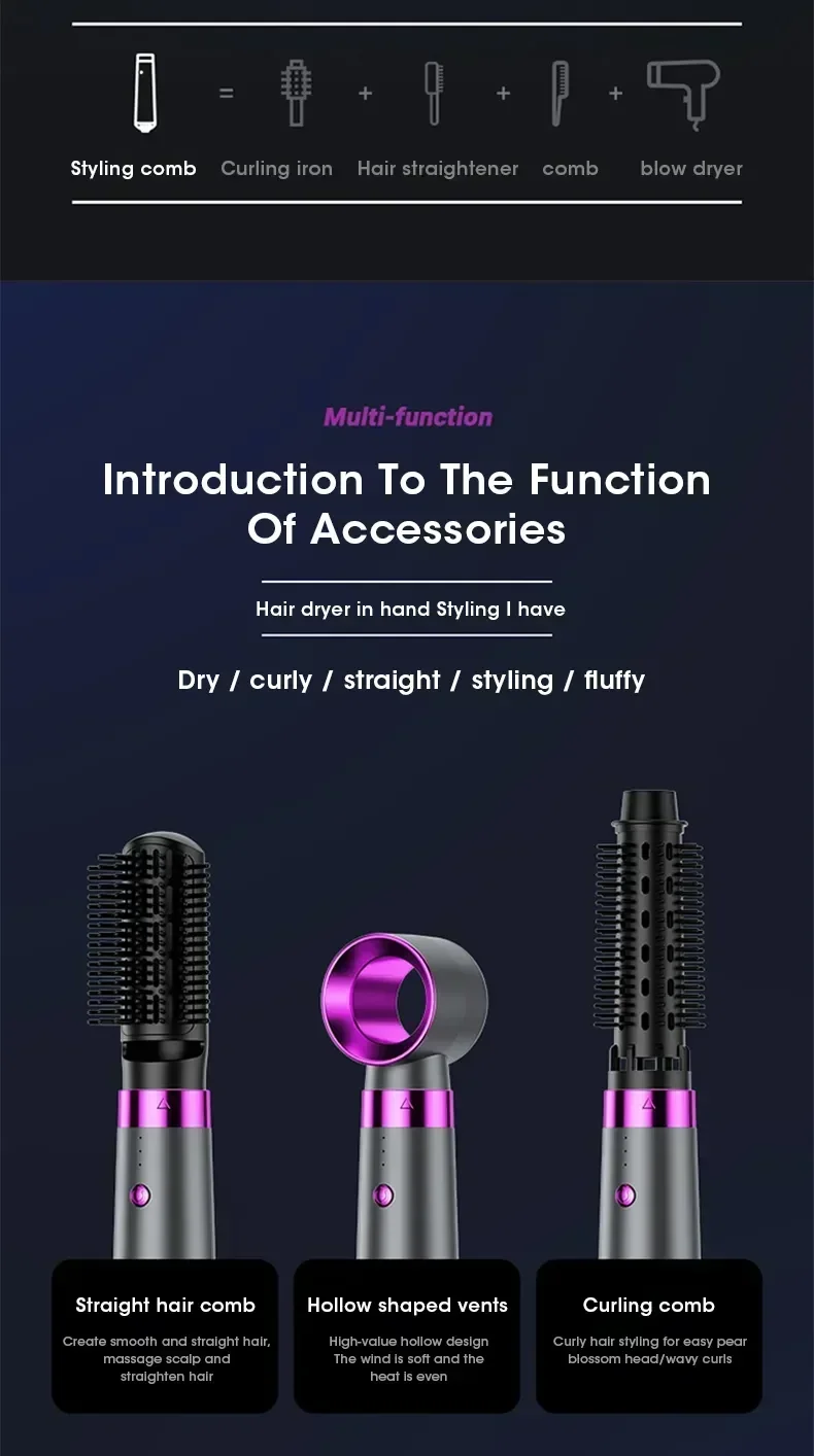 O design inteligente combina escovas e secador em um só aparelho, permitindo que você crie penteados diferentes em minutos, economizando tempo sem comprometer o estilo.
